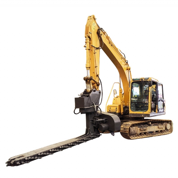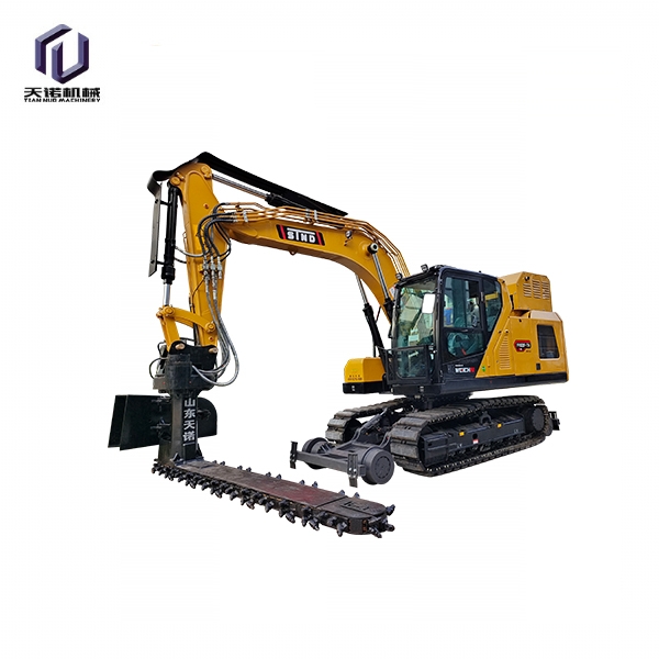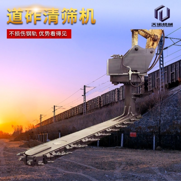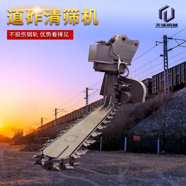 目前,鐵路交通發(fā)展迅速,對于年久的鐵路路基下面的石子需要定期更換,對于鐵路上的清渣機需要大型設備操作十分的不方面,采用人工又十分耗時,工作效率比較低下;為解決上述問題,克服現(xiàn)有技術(shù)的不足,天諾工程機械研發(fā)了一種能夠在狹小空間內(nèi)作業(yè)、操作簡單、效果高的鐵路清渣機;鐵路清渣機包含扒渣鏈部、清渣板部、安裝部和連接部,安裝部設置在扒渣鏈部的上部,其用于與挖掘機連接;清渣板部設置在扒渣鏈部的尾端,清渣板部和扒渣鏈部通過連接部相連;扒渣鏈部包括鏈條,鏈條由若干首尾相連的鏈節(jié)組成,鏈節(jié)包括支座和設置在支座上的截齒;若干截齒呈波浪式陣列布置;安裝部包括上座板和下座板,上座板和下座板之間設置有回轉(zhuǎn)支承,上座板上部設置有兩個相互平行的大耳板。鐵路清渣機是為鐵路道咋清理而設計的一款鐵路專用屬具,鏈條式道咋清理機需安裝在150挖掘機前端,并從軌道外側(cè)位置清理,通過大扭矩馬達帶動免維護鏈條上作業(yè)鏈條上裝置超耐磨的合金屬具對道床道砟進行連續(xù)清理的技術(shù),排列使得道砟的清理及更換更加簡單高 效,提高了施工速度同時節(jié)省了勞動力。